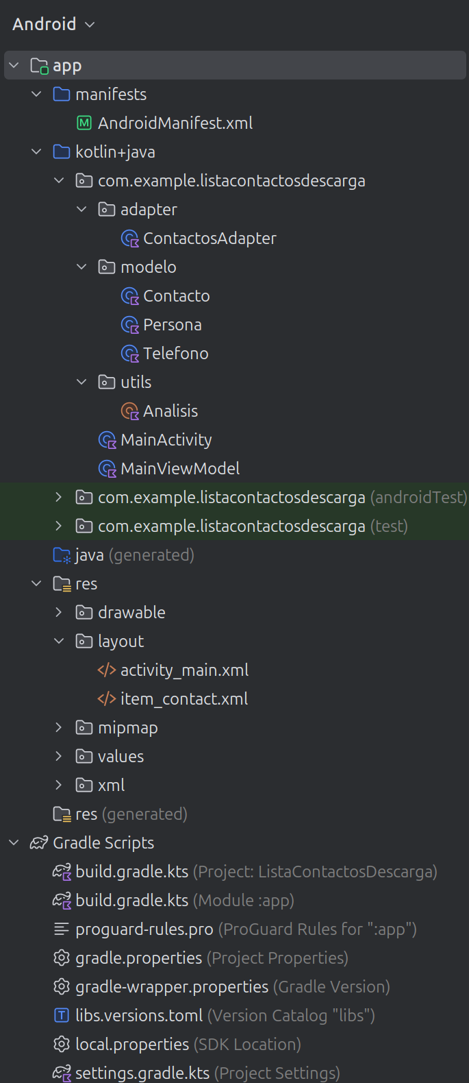 Crear con Android Studio el proyecto ListaContactosDescarga