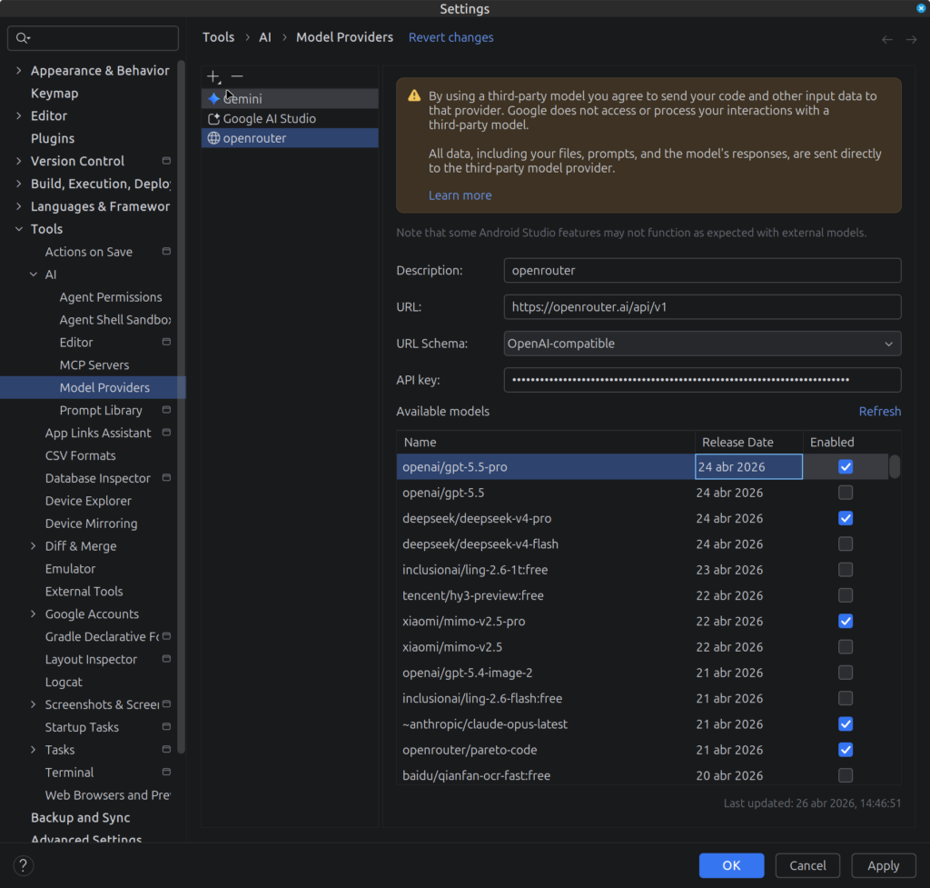 - Crear un API Key en OpenRouter.ai y copiarla para añadirla en Android Studio